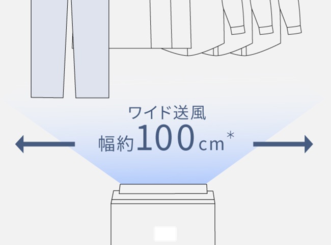 ワイド送風(約100cm)に対応しているため、洗濯物の端まで風が届きやすく、ムラなく乾かしやすい設計になっています。まとめて干した衣類にも風が行き渡りやすく、一度に乾かせるのがいいですね。